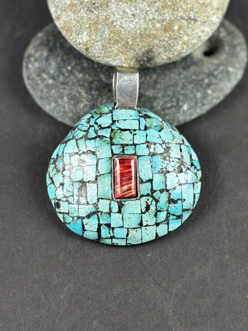 a fantastic example of Santo Domingo Pueblo inlay on shell, a tradition millennia old, this pendant features a rectangle of spiney oyster shell at the center of turquoise mosaic inlay on clam shell with a sterling silver bale. Incredible.